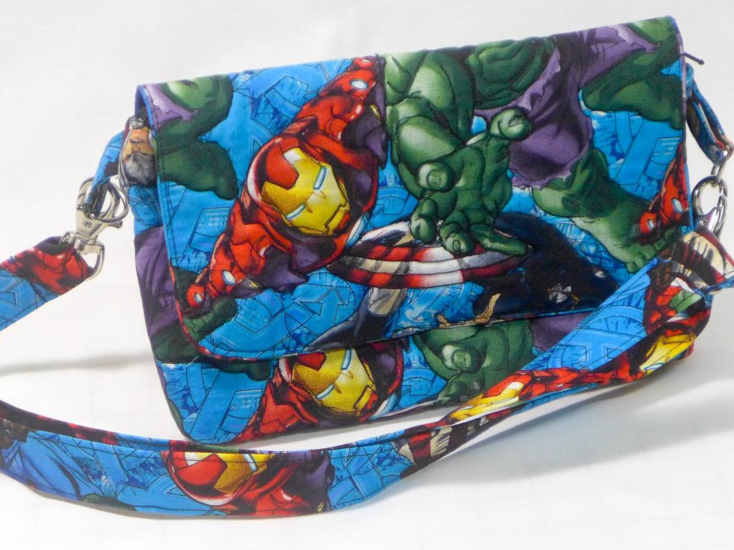 Quilted waist clutch purse (fanny pack) with removable strap, interior pockets and front flap magnetic closure.  Pictured here using an Avenger's theme.